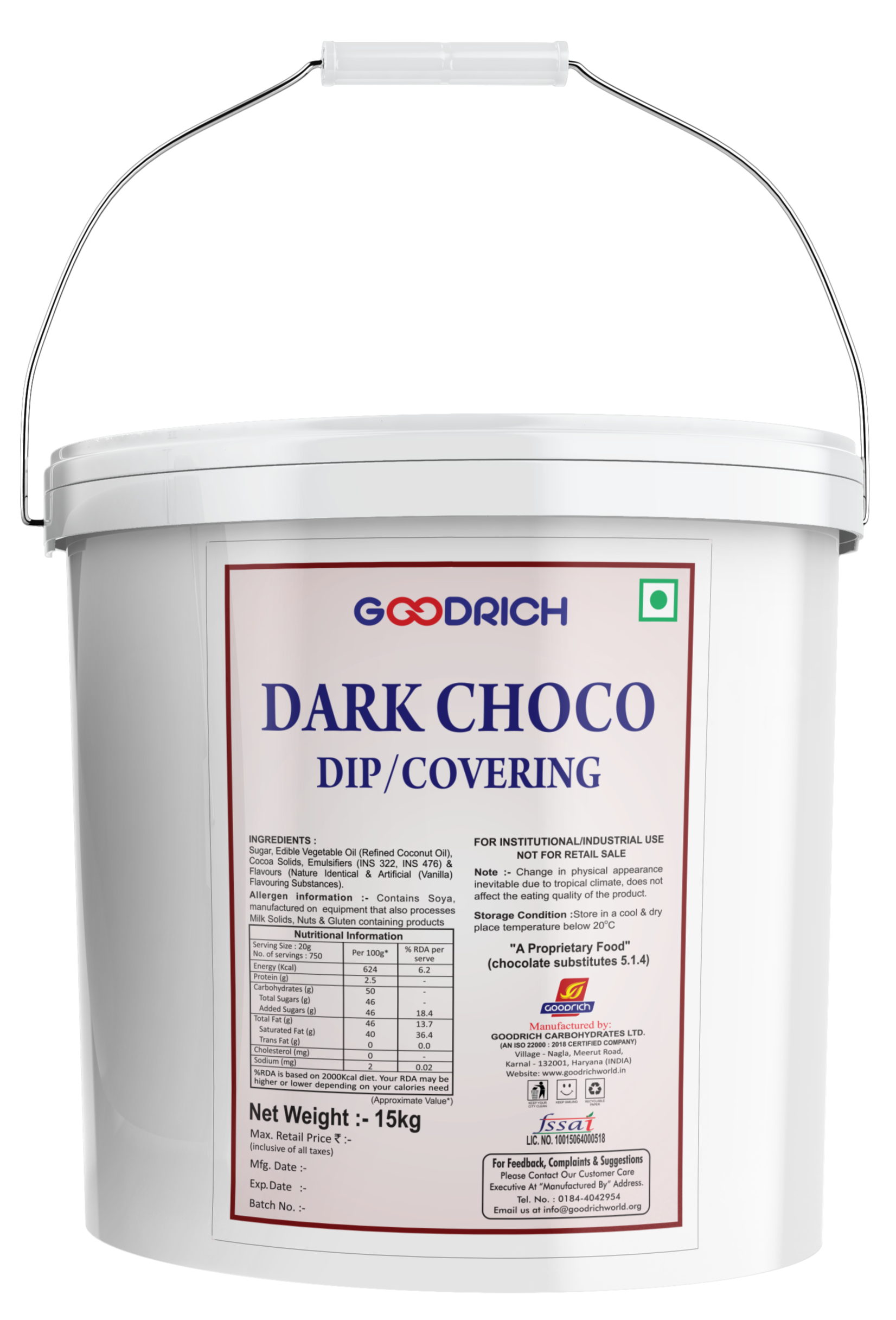 Goodrich Dark Choco  Dips/Covering Dark offers a rich, intense dark chocolate flavor, perfect for coating and dipping fruits, pastries, and baked goods. Ideal for creating a glossy, professional finish on desserts.