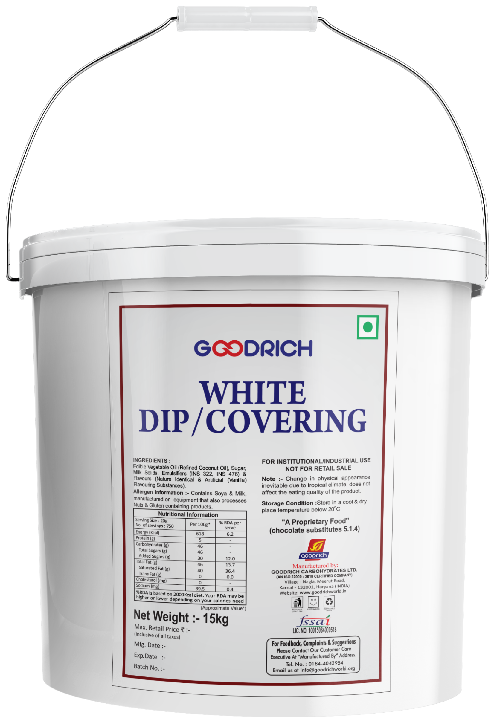 Goodrich Dips/Covering White provides a smooth, creamy white chocolate coating, perfect for adding a glossy finish to cakes, pastries, and desserts. Ideal for professional baking and decoration.